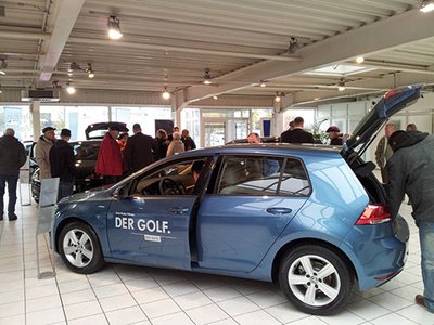 Leuchtende Augen von zahlreichen Autofans waren an diesem Sonnabend Dank genug. Fast jeder Besucher hatte irgendeine Golf-Geschichte zu erzählen. Eine Faszination über Generationen, wie sie kein anderes Modell in der automobilen Welt erzeugt. Eine Geschichte, die nun in der 7. Generation mit vielen technischen Neuheiten fortgeschrieben wird: Karosserie, Antrieb, Interieur, sämtliche Info-, Entertainment- und etliche Assistenzsysteme sowie zwei gänzlich neue Motoren-Generationen hat Volkswagen für sein neues Aushängeschild entwickelt. Beim Alten geblieben ist lediglich der Preis: Mit 16.975 Euro kostet der neue Golf genau das Gleiche wie sein Vorgänger. Der Golf 7 setzt wie gewohnt Maßstäbe für alle, die sich an diesem Auto messen wollen. Die durchweg positiven Meinungen der Besucher zum neuen Golf am 10. November stimmten die Jungs vom TRAVAG-Team äußerst zufrieden.