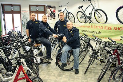 Wenn Elektroautos die Zukunft sind, dann sind die Fahrräder, die man im Zweirad Center Rademacher am Ziegenmarkt bekommt, die ersten Botschafter des neuen mobilen Zeitalters: Im ersten Schweriner Elektro-Bike-Shop ist eine riesige Auswahl der sogenannten Pedelecs erhältlich, abgekürzt für „Pedal Electric Cycles“. Die mit einem elektrischen Motor ausgestatteten Fahräder gestatten sportliches Radfahren ebenso wie die gemütliche Variante mit „eingebauten Rückenwind“.