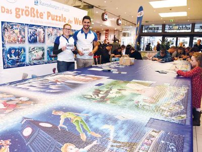 Marienplatz-Galerie zu Gast mit dem wohl größten serienmäßig hergestellten Puzzle der Welt. Es besteht aus sage und schreibe 40.320 Teilen. Das Spiel wird aber nicht fertig zusammengesetzt in die Galerie gebracht – das Puzzeln übernehmen die Besucher des Centers selbst. Alle, die fleißig mitpuzzeln, erhalten zur Belohnung für ihren Einsatz am Ende ein Postkarten-Puzzle geschenkt.