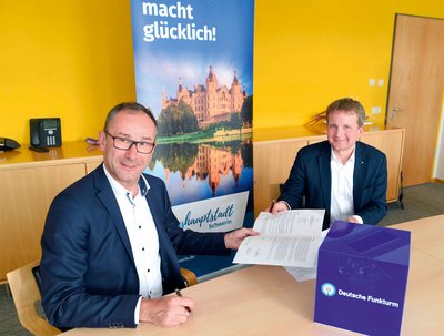 Die Stadt Schwerin und die Deutsche Funkturm GmbH (DFMG) arbeiten beim Mobilfunkausbau in Schwerin zusammen. Dazu haben Oberbürgermeister Dr. Rico Badenschier und Dr. Bruno Jacobfeuerborn, DFMG-Chef, eine Absichtserklärung mit dem Ziel unterzeichnet, den Ausbau einer modernen Mobilfunk-Infrastruktur in Schwerin zu intensivieren und vorzutreiben.