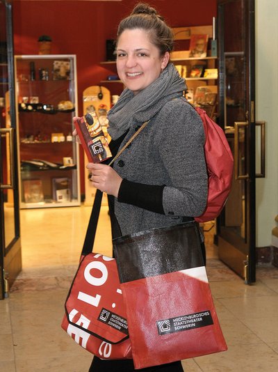 Staatstheater Schwerin setzt mit seinen neuen Fan-Produkten auf „Upcycling“: Aus alten Werbebannern werden vom jungen Schweriner Label „Red Rebane“ Taschen und Portemonnaies hergestellt. Die handgefertigten, wetterbeständigen Unikate gibt es im Theaterladen zu kaufen.
