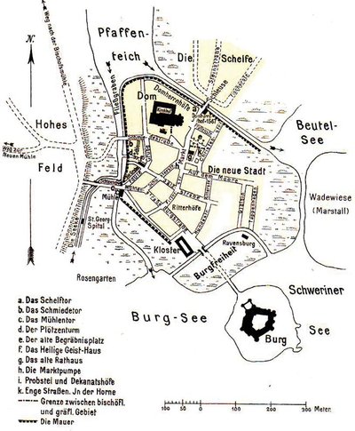 Im Schatten von Dom und Burg konnte man das kleine Rathaus leicht übersehen. Eine Kaufmannsstadt ist Schwerin nie geworden. Abseits der Handelswege gelegen, blickten die Bürger mit Neid auf die reichen Hansestädte Wismar und Rostock. Der ursprünglich 75 mal 75 Meter große quadratische Marktplatz wurde nach und nach bis auf einen kleinen Rest bebaut. Die meisten Bewohner waren Handwerker. Weber, Schmiede, Schlachter, Bäcker, Tuchmacher, Kürschner, Schuster, Schneider und Gerber sind mit eigenen Zünften vertreten. Aber auf der Schelfe und am großen Moor gab es auch noch zahlreiche Bauernhöfe mit Stallungen und Scheunen. Die Zeiten waren unruhig, vor der Stadt wollte niemand wohnen, hier gab es nur Gärten. 1340 erhielt die Stadt eine neue Stadtmauer, die die alte hölzerne Palisade ersetzte.