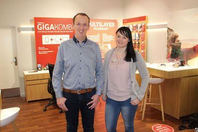 Am 1. Februar hat Silvio Brüning (l.) den Vodafone-Shop in der Marienplatz-Galerie übernommen. Hier bieten er und sein Team um die Filialleiterin Maggy Salow (r.) alle Dienstleistungen des Unternehmens Vodafone an – von Mobilfunk über Festnetz bis Internet und TV. Zur Neueröffnung gibt es noch bis einschließlich 1. April Sonderkonditionen auf viele Verträge.