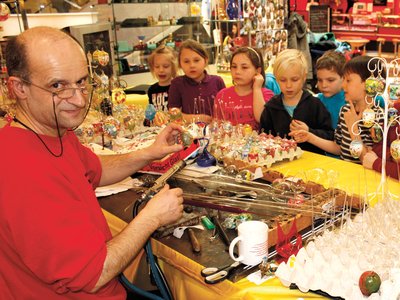 Ostereier ganz anderer Art stehen bei Kalook Wollny im Mittelpunkt. Der sächsische Glasbläser ist erneut und immer wieder gern in der Marienplatz-Galerie zu Gast. Die von ihm hergestellten Glas-Eier werden vor allem von Kindern fantasievoll mit Buntlack bemalt und anschließend mit Glitzer bestäubt.