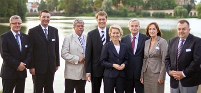 Die Bundesministerin für Arbeit und Soziales, Frau Dr. Ursula von der Leyen (Foto: 4.v.r.) nahm an der Veranstaltung teil und beglückwünschte die mehr als zweihundert geladenen Gäste: „Mecklenburg-Vorpommern hat kost-bare Er-fahrun-gen gemacht“, sagte von der Leyen. „Hier kann der West-en vom Osten ler-nen.“
