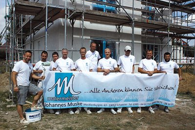 Wem das Geld zu schade ist, in professionell gestaltete Innenwände, Fassaden und Fußböden zu investieren und diese Arbeiten lieber selbst erledigt, der braucht hier nicht weiter zu lesen. Allen anderen sei die gute Arbeit von Malermeister Johannes Muske empfohlen. Seit 2011 heißt sein vorher unter dem Namen Kähler bekanntes Unternehmen wie er selbst – Muske. Vom Hauptsitz in der Mecklenburgstraße schwärmen seine Leute täglich aus, um die Welt mit Farbe etwas schöner zu machen. Erfahrene Fußbodenleger ergänzen das Maler-Team, sobald das nötig ist. Ebenso variiert die „Mannschaftsstärke“ je nach Größe des Auftrags. „Die Beratung ist bei uns das A und O“, betont der 37-jährige Malermeister. „Wir gucken zusammen, was machbar ist, was zum Geschmack des Kunden passt, aber auch zu seinem Geldbeutel.“ Niemandem, so der erfahrene Handwerker, sei mit einer Lösung geholfen, die sich auf Monate oder gar Jahre negativ in den Finanzen bemerkbar macht. Wenn er sagt, „uns ist nichts zu schade“, dann klingt das nicht nach unter-Wert-verkaufen, sondern, im Gegenteil, nach Wertarbeit für jeden Kunden, egal ob klein oder groß.