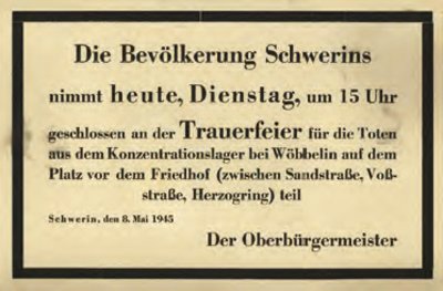 Trotz der chaotischen Zustände beschloss das Militär, die Schweriner mit dem Grauen der Naziherrschaft zu konfrontieren. Alle Einwohner hatten sich am 8. Mai auf dem Platz vor dem Friedhof einzufinden, um an der Beisetzung von grausam entstellten KZ-Häftlingen aus Wöbbelin teilzunehmen.